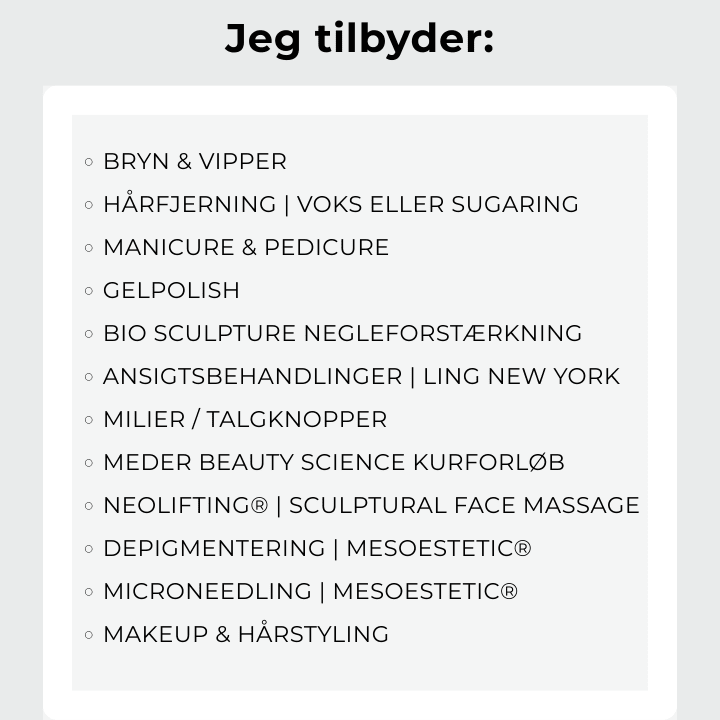 Jeg tilbyder et bredt udvalg af professionelle skønhedsbehandlinger – fra avancerede og non-invasive ansigtsbehandlinger til bryn og vipper, hårfjerning, negle, makeup og hårstyling. Min tilgang bygger på faglighed, kvalitet og naturlige resultater. Alle behandlinger tilpasses din hud, dine behov og din hverdag – samlet ét sted i rolige og trygge rammer.